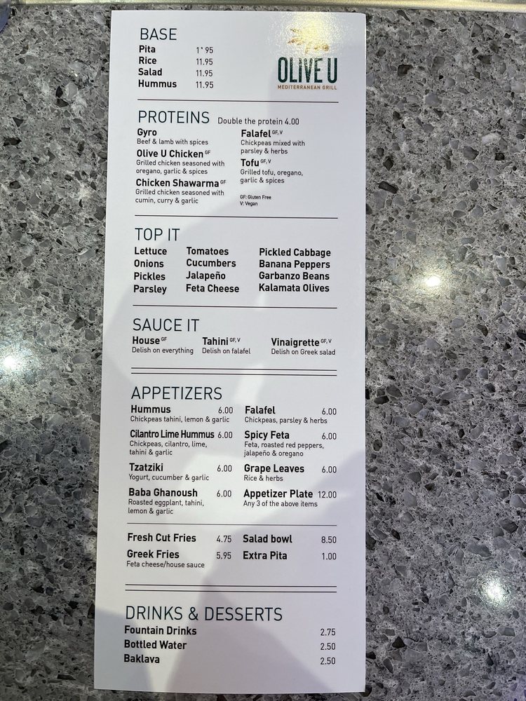 With rave reviews highlighting the friendly service and inviting environment, it’s clear that Olive U Mediterranean Grill is a must-visit destination. Whether you’re looking for a quick lunch or a leisurely dinner, you’re in for a truly satisfying experience.